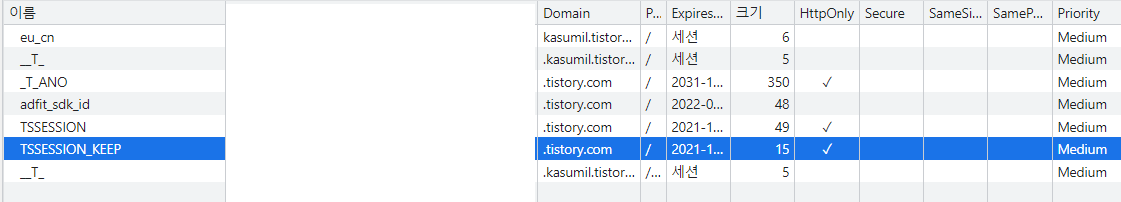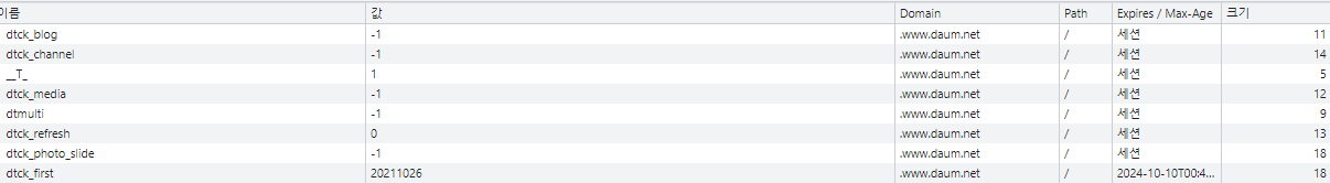 비교를 위해서 다른 사이트의 쿠키 값을 가져왔다.