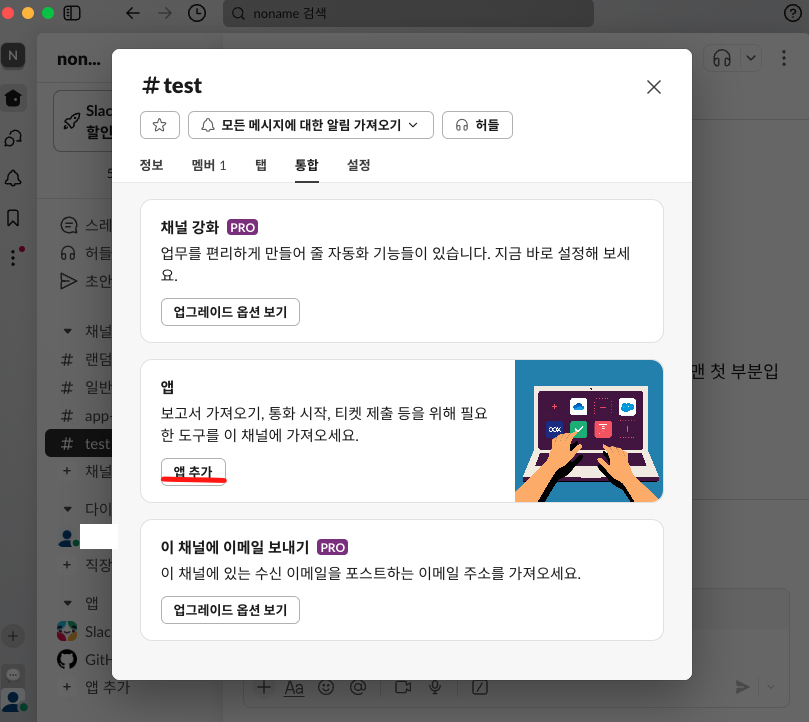 채널내에서 채널 이름을 클릭하면 팝업 모달이 출력됩니다.