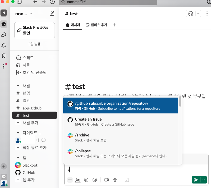 이제 여기서 입력창에서 /github subscribe 유저의 레포를 넣어주세요.