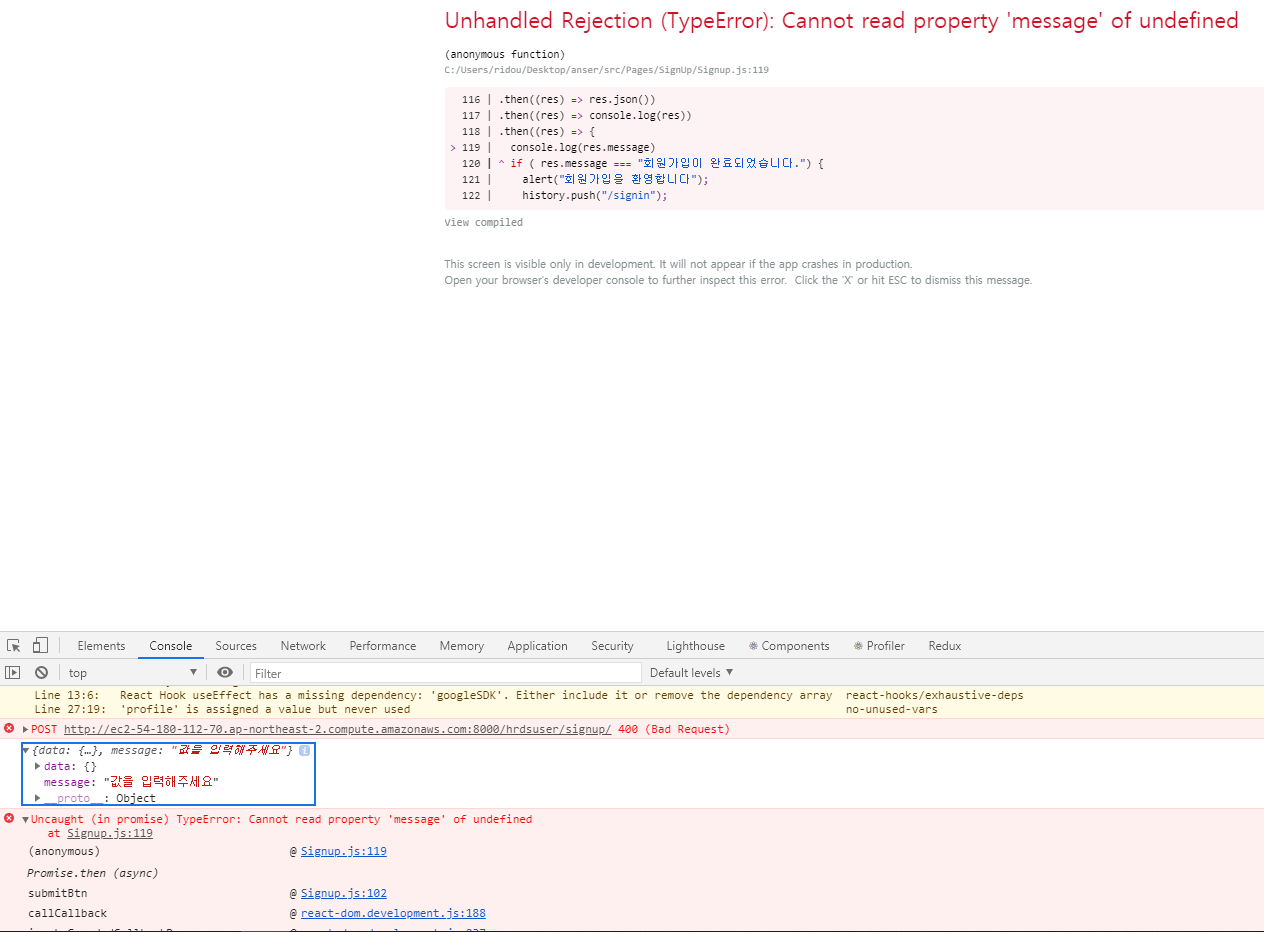 아무튼 이를 해결하고 보니 제대로 넘어가긴 하는데, 나의 코드에서 뭔가 res.message를 보는데, 읽히지가 않는다.